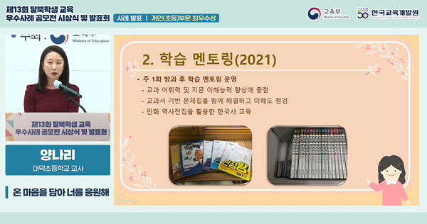 양나리 교사는 ‘온 마음을 담아 너를 응원해’라는 제목으로 2021년부터 운영한 탈북학생 1:1 멘토링 교육 사례를 응모했다. 학생의 개인 수준에 맞는 학습 멘토링과 다양한 경험을 제공하는 문화 멘토링을 운영하여 학생 성장에 기여한 부분을 인정받았다.