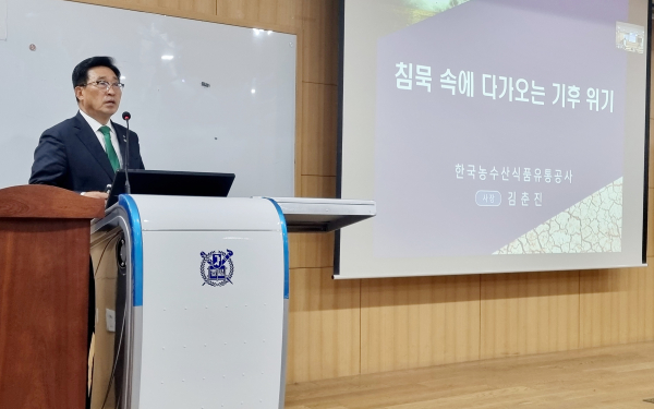 [충청뉴스 최형순 기자] 한국농수산식품유통공사 김춘진 사장은  2일 서울시 관악구 소재 서울대학교 보건대학원에서 ‘침묵 속에 다가오는 기후 위기’란 주제로 서울대 보건대학원생 대상 특별강연을 진행했다.