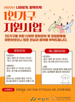 시는 급증하는 1인 가구를 위해 온양반, 배방반으로 나눠 △정리수납 교육 △단정한 용모 가꾸기 △호신술 배우기 △담금주 만들기 △애니멀 테라피 등 다양한 문화 강좌와 모임 활동 시범사업을 운영하고 있다.