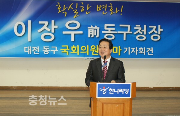 한나라당 이장우 前 동구청장이 12일 대전시당 당사에서 60여명의 지지자 및 당원이 참석한 가운데 19대 총선 출마 기자회견을 갖고, 지역 정치권의 무기력한 정치력이 대전과 동구 발전에 악영향을 미치고 있다고 강도 높은 비판을 했다.