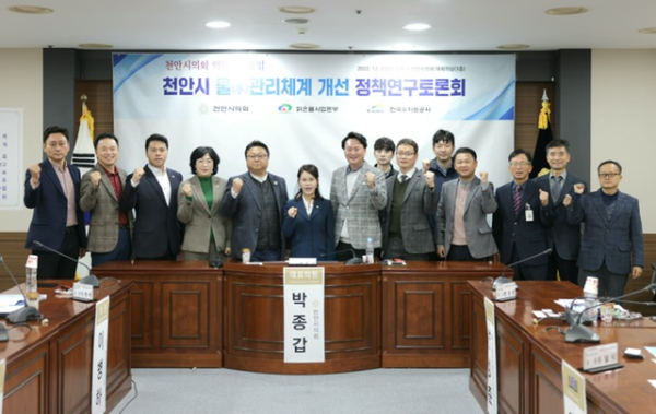 [충청뉴스 박동혁 기자] 천안시의회 의원연구모임(권오중, 김명숙, 김미화, 김영한, 류제국, 이병하, 정선희 의원)은 지난 7일 시의회에서 천안시 물관리 인프라 운영 개선 및 보다 깨끗한 수자원 확보 방안에 대한 '천안시 물관리체계 개선 정책연구토론회'를 개최했다.