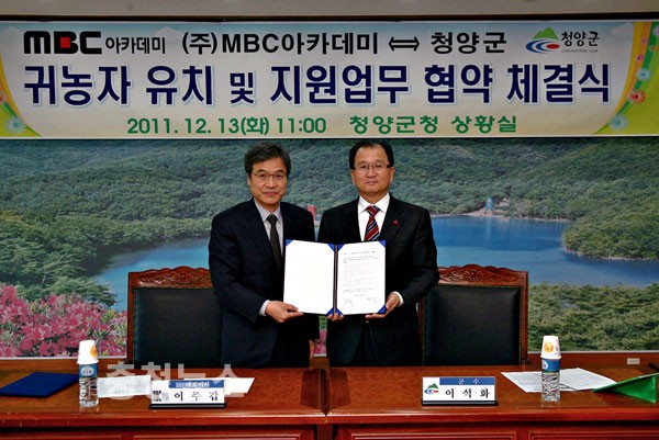 청양군(군수 이석화)과 (주)MBC아카데미(대표이사 이주갑)가 13일 오전 11시 군청 2층 상황실에서 양측관계자 및 군 귀농협의회 임원 등 20여명이 참석한 가운데 귀농자 유치 및 지원업무 협약을 체결했다.