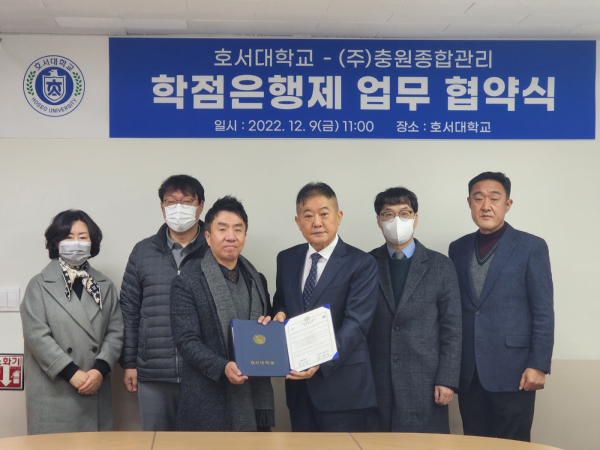 이날 협약식에는 호서대 유영기 평생교육원장, 윤중호 평생교육원 교학팀장, 한종호 경영학 교수와 충원종합관리 장동욱 대표이사, 정원제 전무이사, 박미리 상무이사 등이 참석했다.