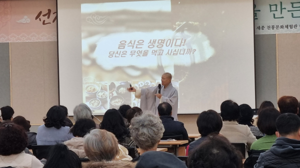[충청뉴스 최형순 기자] 세종 전통문화체험관 선재 스님은 10일 1층 다목적실에서 200여 명의 시민이 참석한 가운데 “음식이 성품을 만든다”라는 주제로 특강을 실시했다.