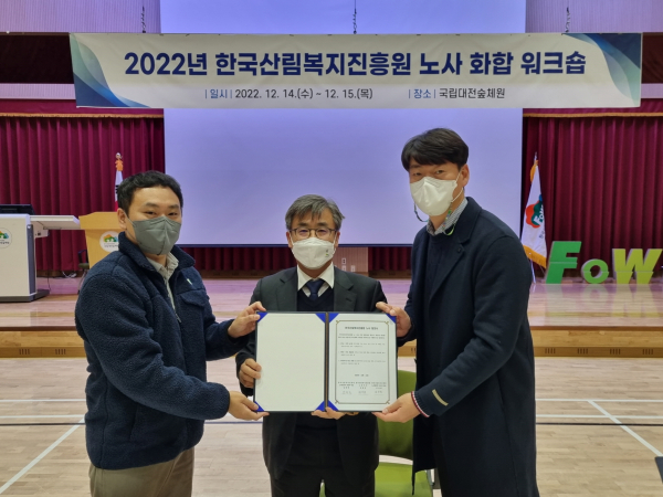 [충청뉴스 최형순 기자] 한국산림복지진흥원(원장 남태헌)은 14일 기관의 생산성과 효율성을 높이기 위한 기관 혁신계획의 성실한 이행에 대한 노사 공동 합의서를 채택했다.