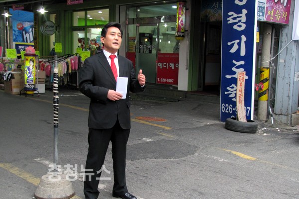 민주통합당 정현태 대덕구 예비후보가 19일 중리시장 앞에서 출마 기자회견을 갖고, 대덕이 어려워진 것은 제대로 된 정치인이 없었기 때문이라고 비판했다.