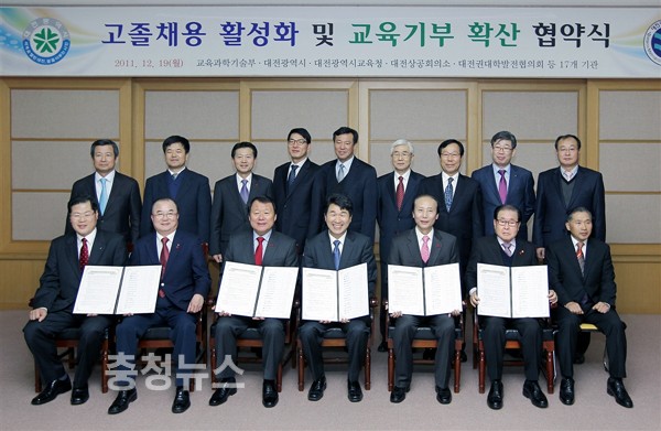 대전시와 교육과학기술부, 시교육청, 대전상공회의소, 대전권대학발전협의회, 기업 및 경제단체 등 17개 기관이 19일 시청 대회의실에서 ‘고졸채용활성화 및 교육기부 확산을 위한 업무협약’을 체결했다.