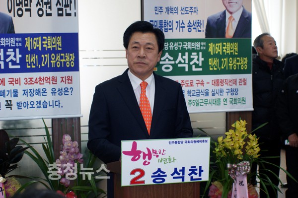 민주통합당 송석찬 유성구 예비후보가 20일 장대동에 위치한 선거사무실에서 출마 기자회견을 갖고, 이상민 국회의원이 입당할 경우 선진당으로부터 공격당해 하루 아침에 침몰당할 것이라고 경고했다.
