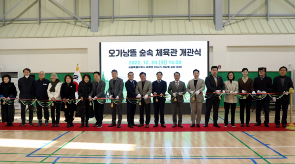 상병헌 의장은 “오가낭뜰 숲속 체육관을 건립하기까지 주민들의 적극적인 참여와 관심은 물론 국비 공모 사업 준비 등을 위한 관계 공무원들의 노고가 큰 발판이 됐다”면서 “앞으로 전천후 사계절 이용 가능한 오가낭뜰 숲속 체육관이 주민들을 위한 건강 증진 및 화합‧교류의 장으로 널리 활용될 수 있길 기대한다”고 밝혔다.