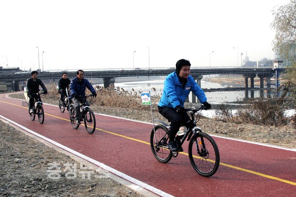 ▲ 정용기 대덕구청장이 21일 자전거를 타고 자전거 도로 점검에 나섰다.