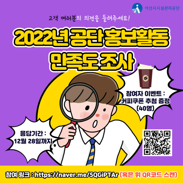 [충청뉴스 박동혁 기자] 아산시시설관리공단(이하 공단)은 내년 공단 홍보 기본계획 수립을 위해 22일부터 오는 28일까지 ‘2022년 공단 홍보활동 만족도 조사’를 실시한다고 밝혔다.