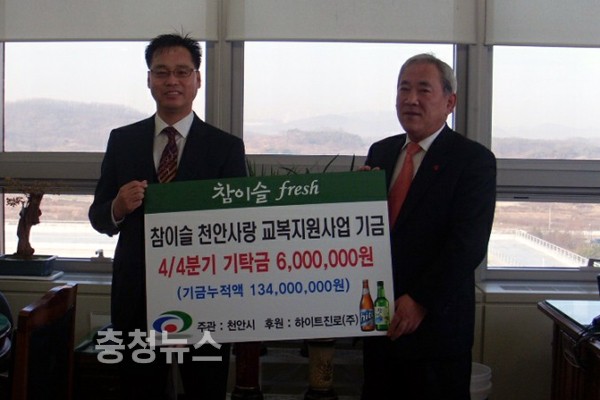 이날 하이트진로는 2011년도 4/4분기 기탁금 6백만원을 전달했으며 기금누적액은 1억3천4백만원이다. 더욱이 총금액 2억원을 목표로 기금을 조성해 나가고 있다.