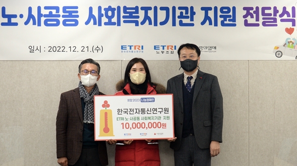 ETRI는 21일 손민호 행정본부장, 제동국 노조위원장, 사회복지공동모금회 이은영 사무처장이 참석한 가운데 성금 전달식을 가졌다고 밝혔다.
