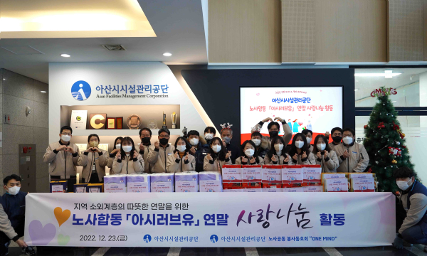아산시시설관리공단(이하 공단)은 23일 연말을 맞아 공단 양대 노동조합인 아산시시설관리공단 노동조합, 세종충남지역노동조합과 함께 지역 소외계층을 위한 ‘아시러브유’ 사랑나눔 활동을 실시했다고 밝혔다.