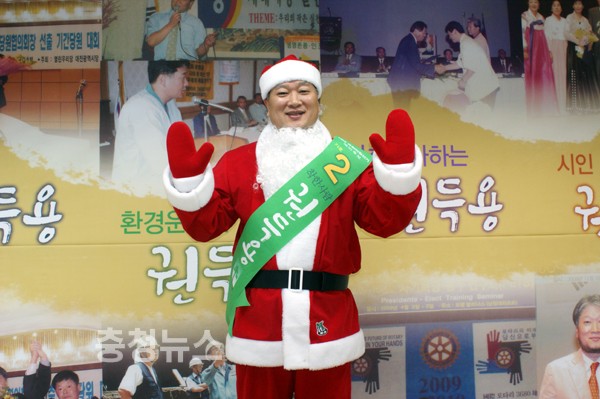 민주통합당 권득용 동구 예비후보가 23일 성탄절을 맞아 하루종일 산타 복장으로 시민들과 인사를 나눠 눈길을 끌었다.