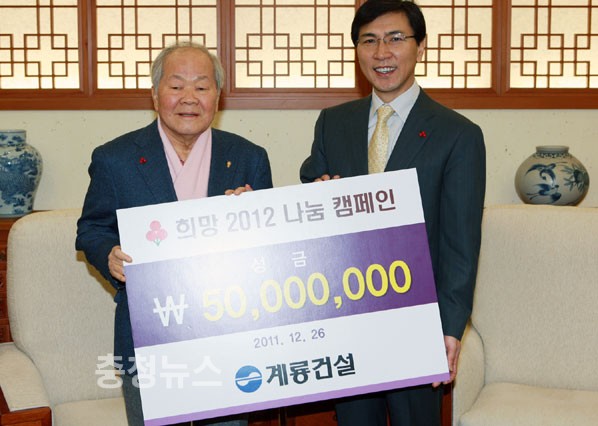 연말·연시 불우이웃 돕기 성금 전달 계룡건설 이인구 명예회장이 26일 오전 충남도청을 방문, 안희정 충남지사에게 불우이웃돕기 성금으로 5천만원을 기탁했다. ▲ 이인구 명예회장이 안희정 충남지사에게 5천만원을 전달했다. 이인구 명예회장은 충남대학교 행정대학원을 졸업했으며 계룡장학재단 이사를 겸직하고 있다. 저작권자 © 충청뉴스 무단전재 및 재배포 금지 서지원 다른기사 보기 기사가 마음에 드셨나요? 충청뉴스 좋은 기사 후원하기 1,000원 3,000원 5,000원 10,000원 30,000원 50,000원 직접입력 비회원 약관동의하기 ※ 소중한 후원금은 더 좋은 기사를 만드는데 쓰겠습니다.