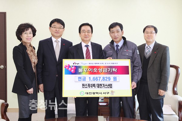 대전 서구(구청장 박환용)는 26일 어려운 이웃을 돕기 위해 실시한 ‘기부천사 탄소캐쉬백’ 인센티브 170여만원을 어려운 저소득층을 위한 생필품 지원에 사용하기 위해 대전 사회복지공동모금회에 지정 기탁했다.