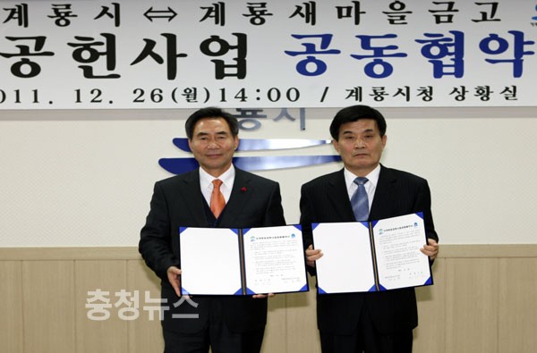 계룡시(시장 이기원)와 계룡새마을금고(이사장 하호병)는 26일 시청 상황실에서 ‘계룡 지역희망공헌사업’ 공동 협약식을 체결했다.
