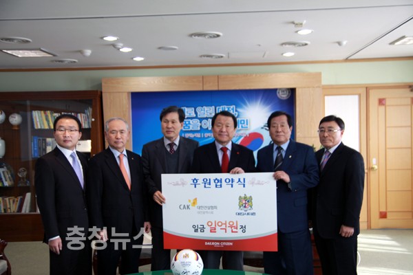 대한건설협회 대전시회가 27일 대전시티즌과 후원협약을 맺고 후원금을 전달하면서 내년 시즌 대전시티즌의 발전을 기원했다.
