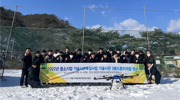 중소기업 기술사관 사업에 참여하고 있는 이 학생들은 드론 원리 및 비행실습교육과정에 참여하여 학과교육 20시간, 모의교육 6시간, 드론비행 실기교육 6시간의 교육을 이수 및 평가 후 자격증을 취득했다.