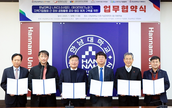 이번 협약식에서 LINC3.0사업단은 대전테크노파크와 대덕이노폴리스벤처협회, 바이오헬스케어협회, 연구소기업협회, 한남대 가족회사(스페셜원 이시권 대표) 등 지역의 대표 기업협회들과 협약서를 교환했다.