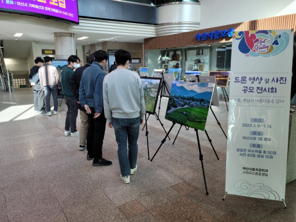 [충청뉴스 박동혁 기자] 충남 아산시는 오는 13일까지 시청 로비에서 드론 영상·사진 공모전 작품 전시회를 개최한다고 밝혔다.