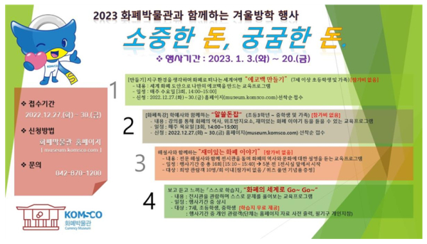 화폐박물관 황윤지 차장은 “우리의 일상 속에서 없어서는 안 될 돈에 대해 자세히 알아보고 궁금증을 풀어보는 유익한 기회가 될 것” 이라며 “겨울방학 아이와 함께 유익한 시간을 보낼 수 있는 프로그램으로, 화폐의 역사, 화폐에 적용된 위조방지요소, 화폐에 숨겨진 재미있는 이야기 등 흥미로운 사실들을 직접 체험해 볼 수 있는 기회를 마련하였다”라고 말했다