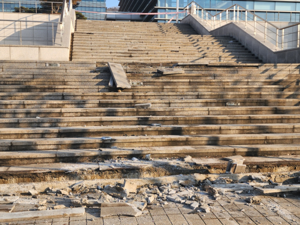 새벽 음주 차량이 천안시청사 계단으로 돌진해 그 충격으로 계단이 파손됐다/박동혁 기자