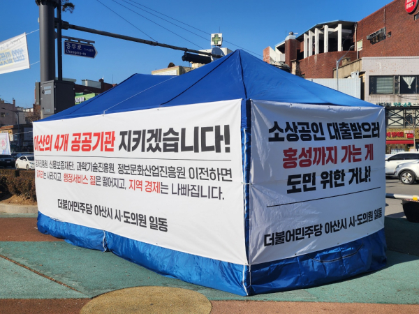 '아산 소재 공공기관 이전 반대' 시민 서명을 위한 천막/박동혁 기자