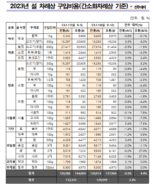 한편, 가족 구성원 감소로 차례를 간소하게 지내는 추세를 반영한 간소화 차례상(18개 품목)은 전통시장 12만 586원, 대형유통업체 14만 4064원이 소요되는 것으로 조사됐다.