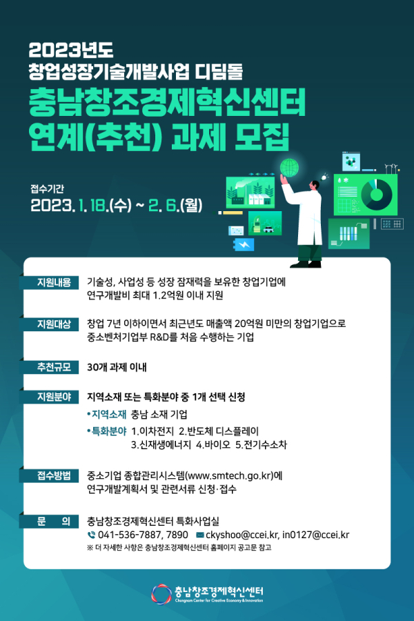 [충청뉴스 박동혁 기자] 충남창조경제혁신센터(이하 충남창경센터)는 ‘2023년 창업성장기술개발사업(디딤돌)’에 참여할 기업을 내달 6일까지 모집한다고 밝혔다.