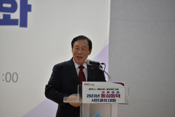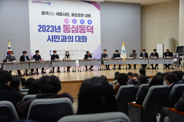 [충청뉴스 최형순 기자] 최민호 세종특별자치시장이 19일 아름동 복컴 다목적 강당에서 실·국장, 김재형, 윤지성, 최원석 시의원과 함께 제2차 ’2023년 동심동덕 시민과의 대화‘에 나섰다.