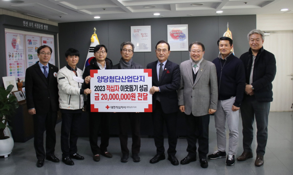 [충청뉴스 박동혁 기자] 충남 천안시 직산읍에 위치한 양당첨단산업단지 입주 기업들이 지난 25일 천안시청 시장실을 방문해 대한적십자사 충남지사에 이웃돕기 성금 2,000만원을 전달했다.