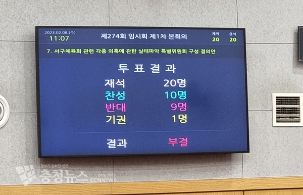 [충청뉴스 이성현 기자] 대전 서구의회가 서철모 서구청장의 서구체육회장 선거 관련 의혹 조사기구인 이른바 '서철모 조사특위' 구성에 실패했다.