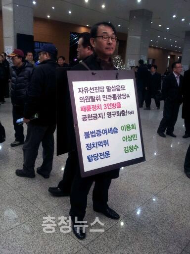 경기도 일산 킨텍스에서 열린 '민주통합당 당대표 및 최고위원 선출대회'에서 자유선진당 말살음모를 규탄하는 1인시위 피켓 있어 눈길을 끌었다.