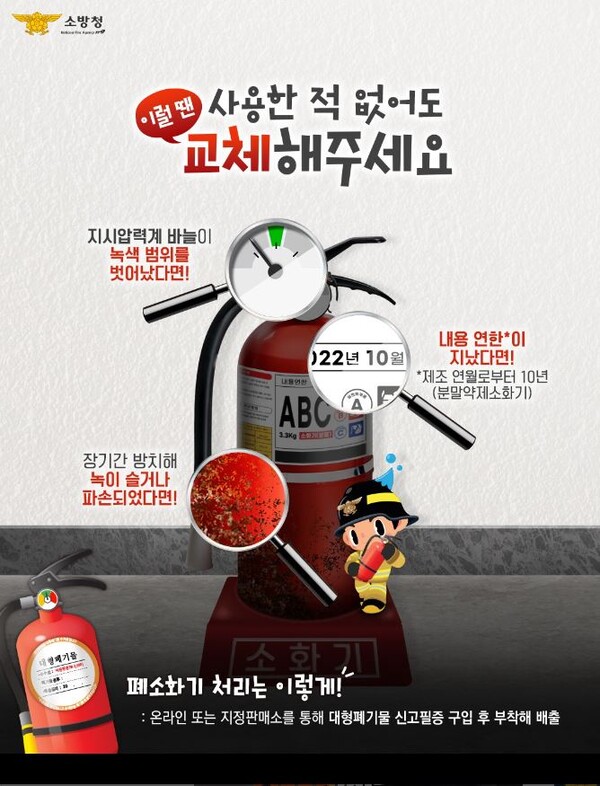 [충청뉴스 박동혁 기자] 천안서북소방서가 제조일로부터 10년 이상 된 노후 소화기에 대한 교체 및 폐기를 당부했다.