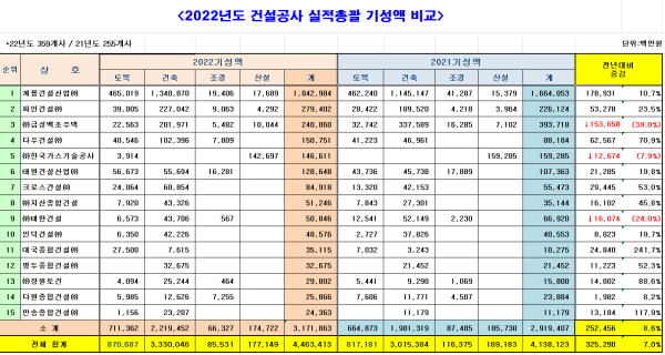 이는 2021년 기성실적(4조1381억 원) 대비 3252억 원(7%) 증가한 수치로 2021년에 이어 역대 최고치를 경신하게 됐다.
