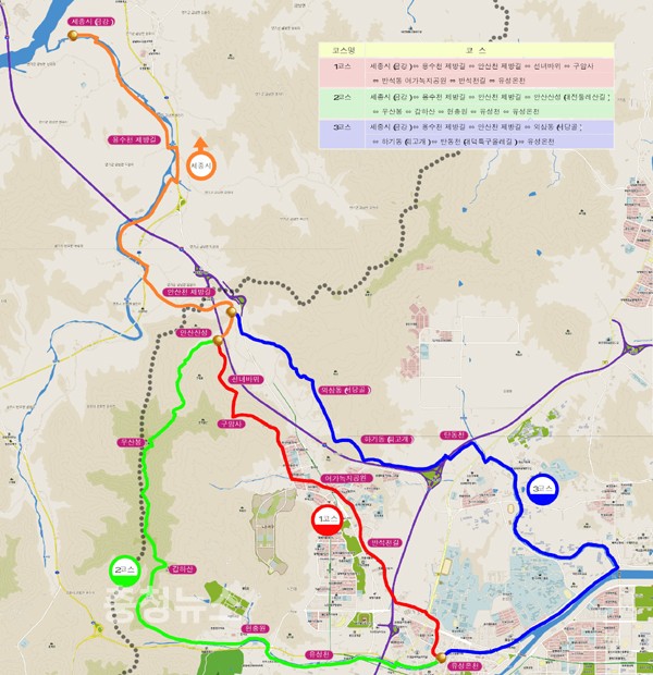 각 코스는 모두 유성온천에서 시작해 세종시로 연결되며 1코스는 구암사와 반석동을 거치고, 2코스는 국립대전현충원과 갑하산, 우산봉을 통과하며 3코스는 대덕특구 올레길과 외삼동, 안산천을 따라 조성될 예정이다.