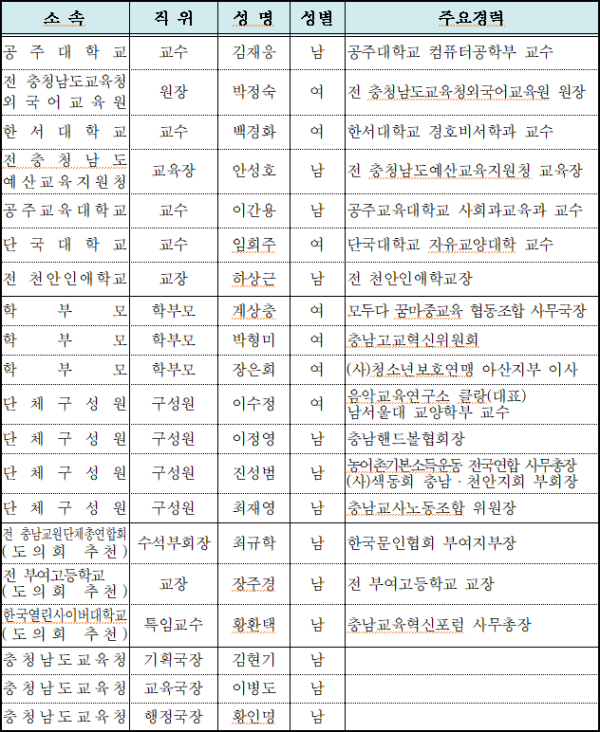 이번에 위촉된 충청남도미래교육자문위원회는 모두 20명으로, 분야와 성별 등을 고려하여 공개모집, 도의회 추천 방식으로 외부위원 17명, 내부위원 3명으로 구성됐다.