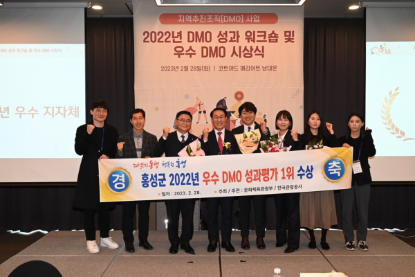 2022 한국관광의 별 특별상 수상한 ‘홍성 DMO사업단’은 지난 2월 28일 문화체육관광부가 주최하고 한국관광공사에서 주관한 ‘2022년 DMO 우수사업 시상식’에서 전국 총 21개 지자체 가운데 S등급 종합 1위로 선정돼 전국 유일 3년 연속 1위를 수상하는 쾌거를 이뤘고 홍성군은 감사패를 수여 받았다.