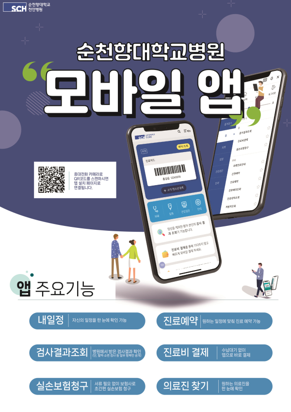 순천향대천안병원 스마트폰 앱은 구글 플레이, 애플 앱스토어에서 ‘순천향대학교병원’ 검색 후 설치해 사용할 수 있다.