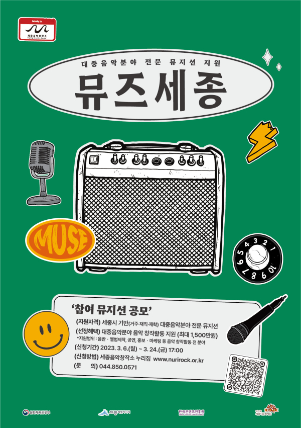 [충청뉴스 최형순 기자] 세종시문화재단(대표이사 김종률)은 대중음악 창작활동 지원사업 ‘뮤즈세종’에 참여할 뮤지션을 선발한다.