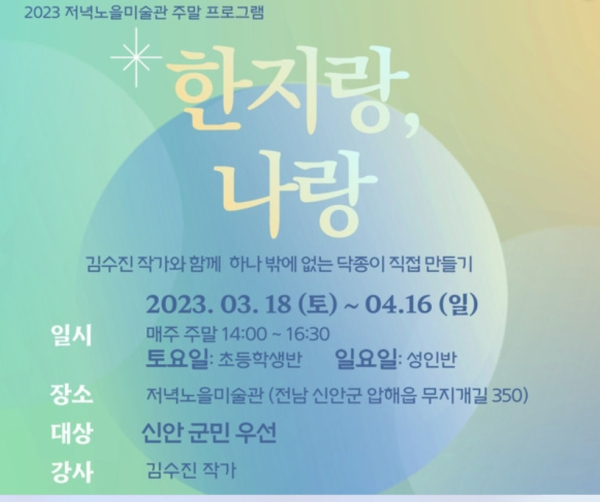 [충청뉴스 최형순 기자] 신안군(군수 박우량) 저녁노을미술관에서는 신안군민 초등학생 및 성인을 대상으로 오는 3월 18일(토)부터 4월 16일(일)까지 주말교육프로그램 '한지랑, 나랑'을 운영한다.