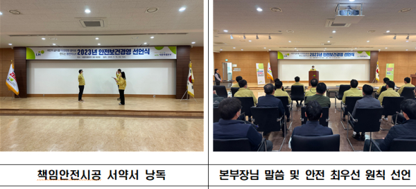 [충청뉴스 최형순 기자] LH 세종특별본부(본부장 이대영)는 15일, 본부 대강당에서 건설관련 부서장 및 현장 감독소장 등 약 40명이 참석한 가운데 “2023년 LH 세종특별본부 안전보건경영 선언식”을 개최하였다.