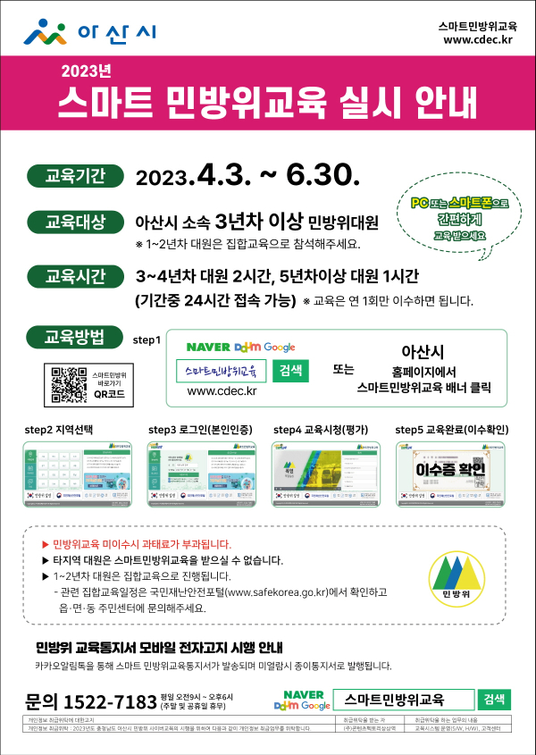 시 관계자는 “3년 만에 민방위 교육을 정상 운영하게 됐다”며 “교육 불참으로 인한 과태료 처분 등 불이익을 당하지 않도록 교육 이수에 노력해주길 당부드린다”고 말했다.
