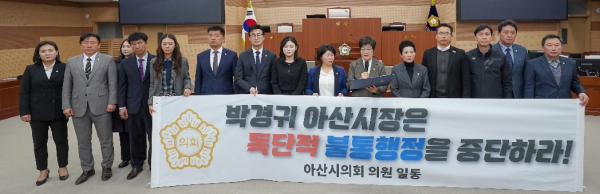 김희영 아산시의장은 대표로 낭독한 성명서를 통해 “박경귀 시장이 잘못된 결정을 바로 잡을 수 있도록 충분한 시간을 줬음에도 불구하고 고집과 불통만 확인했다”며 “신의를 저버린 시 집행부와 앞으로 더 이상의 협치는 없다”고 성토했다.