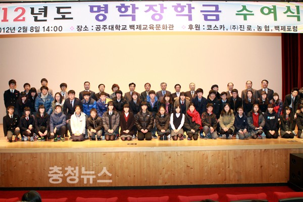 재단법인 명학장학회(이사장 최석원)와 하이트진로(주)(지점장 오양균)는 8일 공주대학교 백제교육문화회관에서 ‘2012년도 명학장학금 전달식’을 가졌다.