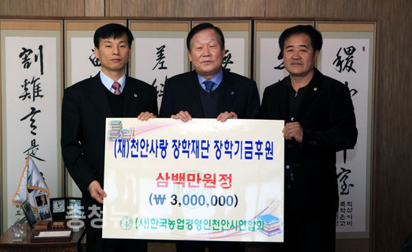 (사)한국농업경영인 천안시연합회(회장 김연응)는 9일 오전 천안시(시장 성무용)를 방문 (재)천안사랑장학재단 장학금 후원금으로 3백만원을 기탁했다.