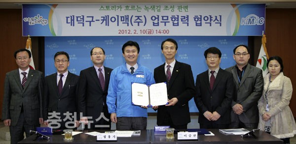 대덕구(정용기 구청장)는 지난 10일 오후2시 구청 중회의실 에서 케이맥 주식회사(이중환 대표이사)와 스토리가 흐르는 녹색길 조성을 포함한 지역사회 발전을 위한 상호 업무협력 협약식을 개최했다.
