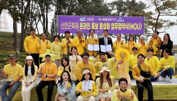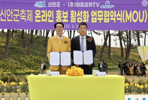 [충청뉴스 최형순 기자] 신안군(군수 박우량)은 30일 ㈜아프리카TV(대표이사 정찬용) 소셜미디어사업부문장 이민원 상무 및 관계자와 신안군 도·군의원 및 BJ오세블리, 대륙남TV가 참석한 가운데 신안군 축제의 온라인 홍보 활성화를 위한 업무협약을 체결했다.